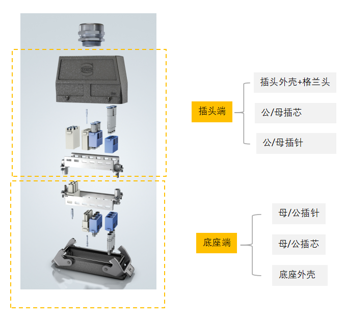 一个完整的矩形连接器由以下单个部件组成: